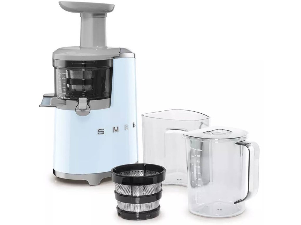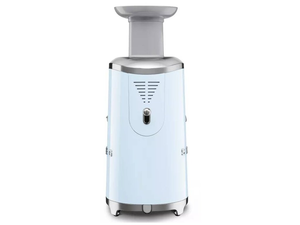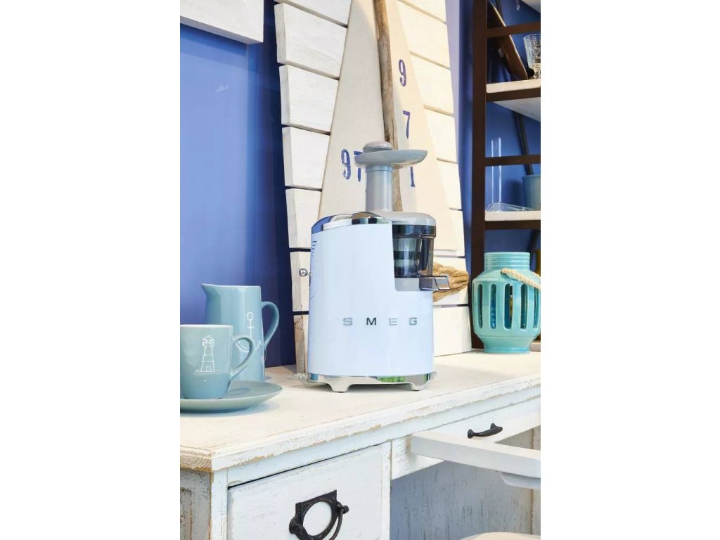 Šnekový odšťavovač Smeg SJF01PBEU je vyrobený z Ultem™ (termoplast, ktorý v sebe spája vynikajúce tepelné vlastnosti, výnimočnú tvarovú stálosť a dobrú chemickú odolnosť). Vnútorné nádoby na šťavu a dužinu sú vyrobené z Tritanu™, 2 sitká z nehrdzavejúcej ocele - jemné a hrubé, výlevka z Tritanu s ochranou proti odkvapkávaniu, páka z nehrdzavejúcej ocele na zapnutie a vypnutie. Priehľadná tritánová výlevka má klapku, ktorá umožňuje okamžité zastavenie toku vylisovanej šťavy. Vnútorná nádoba na šťavu s objemom 0,5 l je vybavená 4 vyberateľnými, rotujúcimi silikónovými kefkami, ktoré zabraňujú upchatiu odtoku šťavy prípadnými usadeninami. Je priehľadná a má čiaru vyznačenú po 50 ml, takže môžete ľahko skontrolovať množstvo a hustotu šťavy v nádobe. Reverzibilný 150 W indukčný motor pracuje ticho a spoľahlivo pri pomalých otáčkach 43 ot/min. Vďaka funkcii "Reverse" je možné zapnúť spätné otáčanie, a tak prípadne uvoľniť kúsky dužiny, ktoré upchávajú šnekový lis.