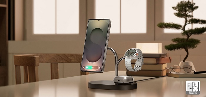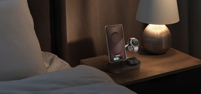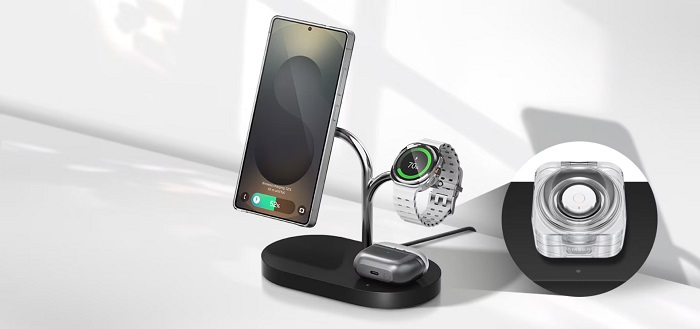 Tato elegantní nabíjecí stanice vám umožní nabíjet až tři zařízení současně – váš telefon, hodinky Galaxy Watch a sluchátka Galaxy Buds. Díky speciálně navrženým nabíjecím cívkám pro každé zařízení probíhá nabíjení rychle a efektivně bez zbytečného čekání. Pro vaše hodinky Galaxy Watch je připraveno intuitivní řešení, kdy se po položení na nabíječku samy optimálně nastaví a ihned začnou vysokou rychlostí nabíjet. O bezpečné a spolehlivé nabíjení všech vašich zařízení se postarají ultra silné magnety, které je dokonale zarovnají.