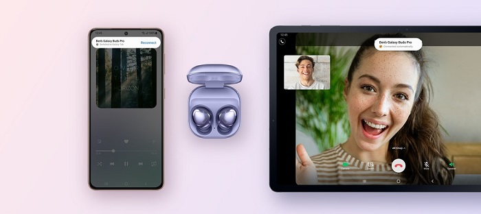 Slúchadlá Galaxy Buds Pro od spoločnosti Samsungrozpoznávajú viacero zariadení, ku ktorým sú pripojené, a dokážu medzi nimi inteligentne prepínať. Ak vám teda zazvoní telefón, zatiaľ čo sledujete film na tablete, Buds Pro okamžite prepnú zvuk na váš hovor. Po skončení hovoru sa zvuk automaticky vráti k sledovanému filmu.