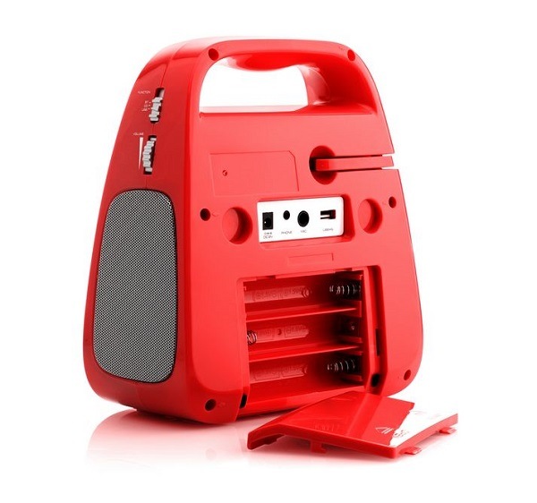 Zadná strana prehrávača GoGEN Déčko ponúkapriestor na uloženie batérií a všetky potrebné vstupy na používanie prehrávača.