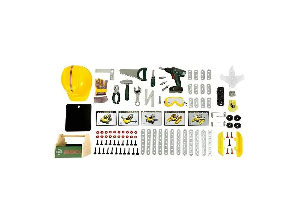 - Súprava obsahuje aj prilbu, okuliare, rukavice, chrániče sluchu, skrutkovače, kladivá, kliešte, pílu, uholník, meradlá, zverák, skrutky, matice, koľajničky či mnoho ďalšieho...