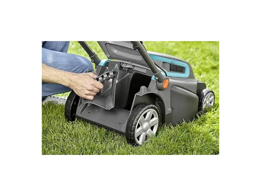 Elektrická kosačka Gardena PowerMax 42 E / šírka záberu 42 cm / 1800 W / 45 l / 800 m2 / čierna/tyrkysová
