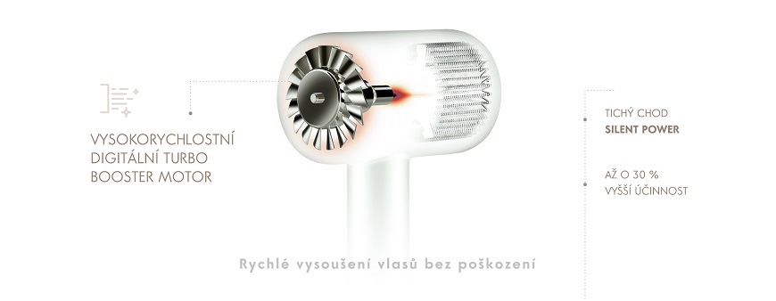 Díky digitálnímu motoru TURBO BOOSTER, budou vaše vlasy vysušeny během chviličky. Tento extrémně výkonný motor je totiž až o 30 % účinnější, než běžné fény. Motor navíc vyniká i dlouhou životností, vysokou odolností a tichým chodem.