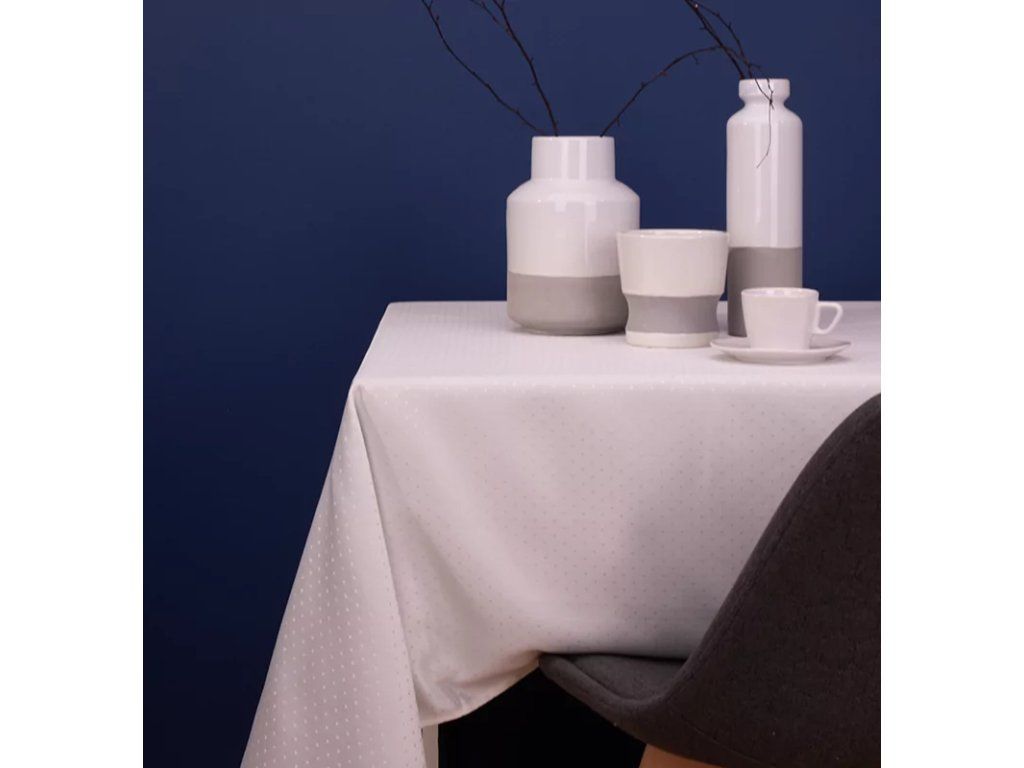 Ubrus je vyroben ze 100% polyesteru, který se vyznačuje dlouhou životností, tvarovou stálostí a snadnou údržbou. Textilie dobře přiléhá ke stolu, nemačká se nadměrně a zachovává si svůj vzhled i při častém používání.