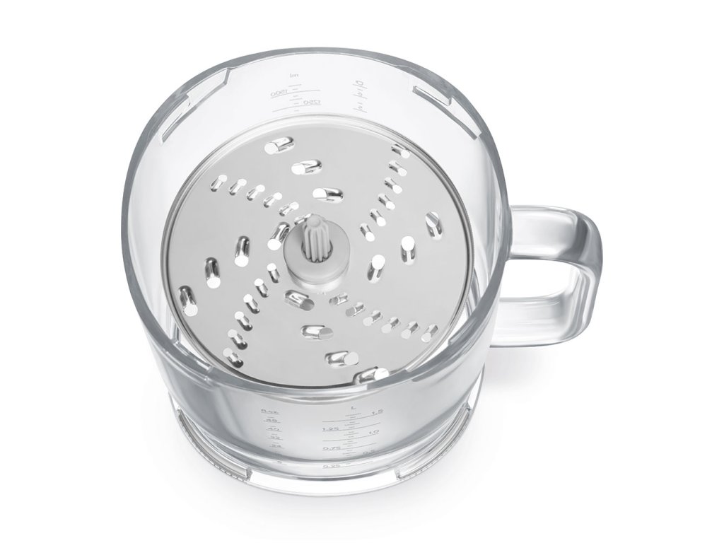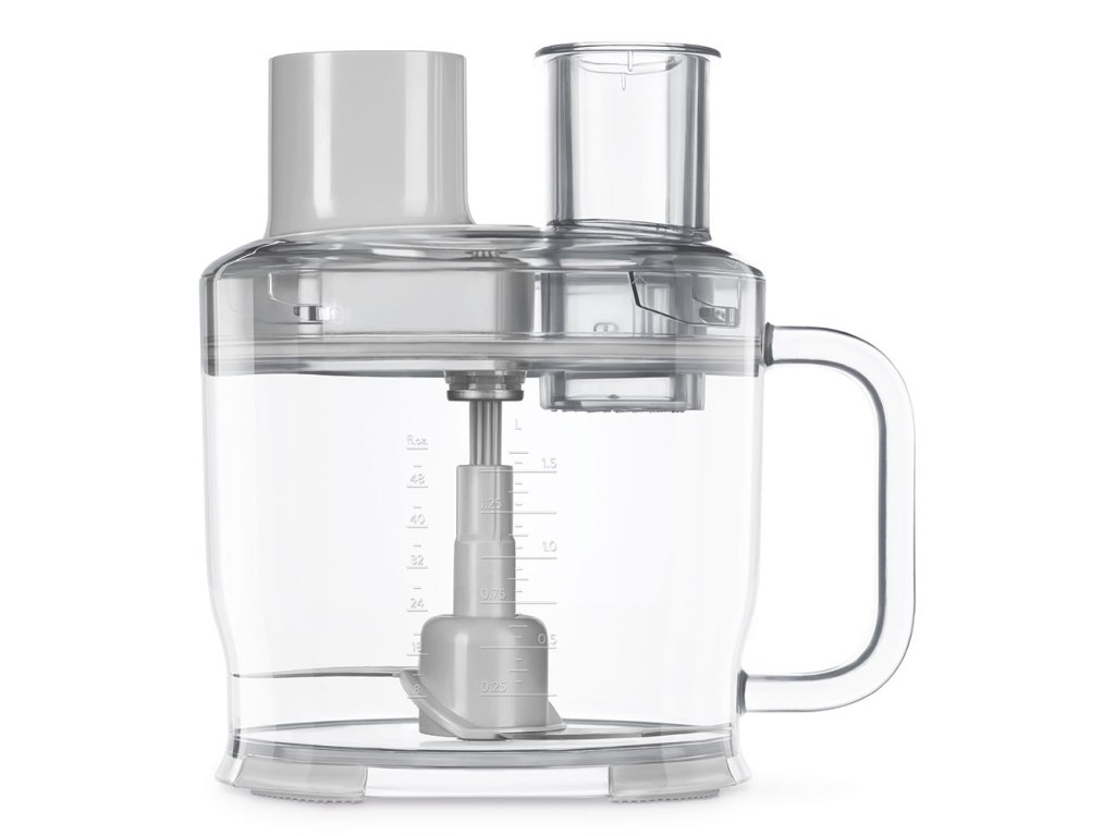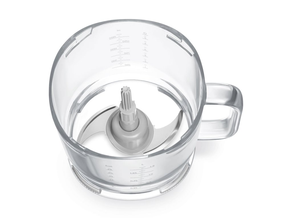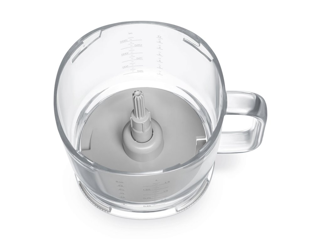 Pracovná nádoba s objemom 1,5 litra je vyrobená z odolného, priehľadného materiálu Tritan™ bez obsahu BPA a je vybavená priehľadným meradlom. Protišmyková základňa zaisťuje stabilitu pri práci, ergonomická rukoväť zabezpečuje pohodlnú manipuláciu. Všetky časti možno ľahko rozobrať a umyť v umývačke riadu, takže údržba je rovnako jednoduchá ako používanie.