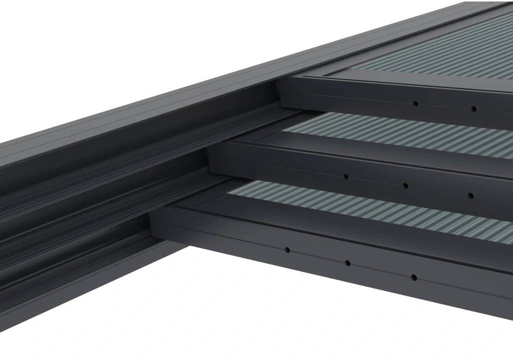 Moderný dizajn s posuvnou strechouŠtýlová pergola v antracitovej farbe RAL9004 prirodzene doplní modernú aj klasickú architektúru. Posuvná strecha s 3 úrovňami nastavenia umožňuje regulovať množstvo svetla a prúdenie vzduchu podľa vašich potrieb. Ľahká, ale pevná konštrukcia dodáva čistý a nadčasový vzhľad. TIP: Otvorením strechy v horúcich dňoch vytvoríte príjemne vetraný priestor bez prehrievania.