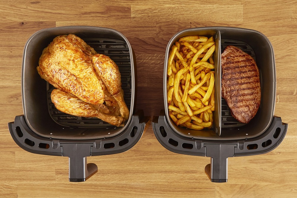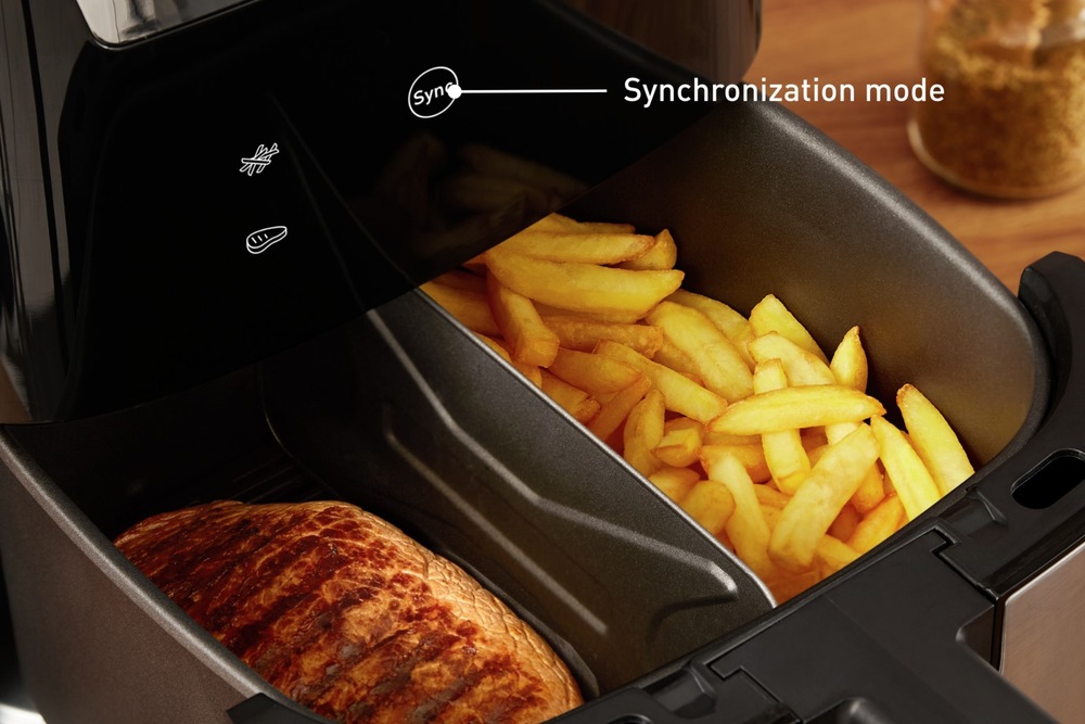 Pripravte chutné a zároveň zdravé jedlá pre celú rodinu s kombináciou horúcej fritézy a grilu 2 v 1. S celkovým objemom 6,5 l/2 kg dokáže pripraviť jedlo až pre 8 osôb - vrátane dvoch jedál súčasne vďaka odnímateľnému oddeľovaču Flexcook. Navyše ich dokáže pripravovať súčasne vďaka režimu inteligentnej synchronizácie.
