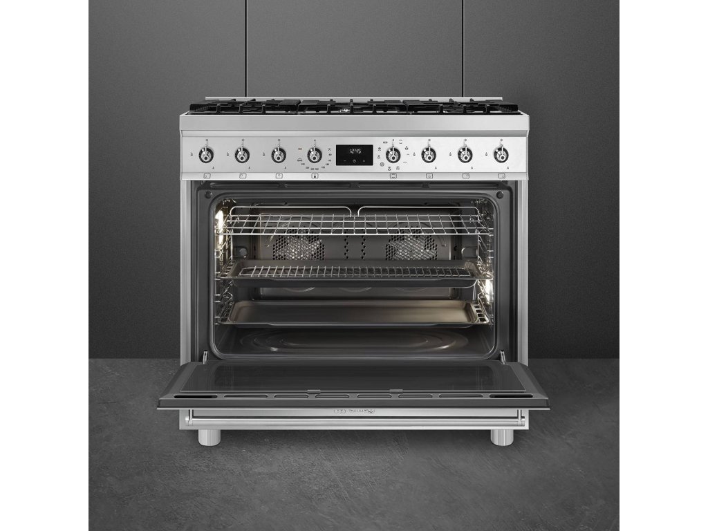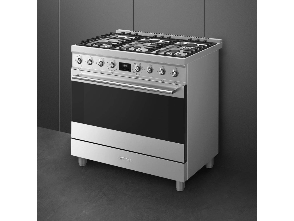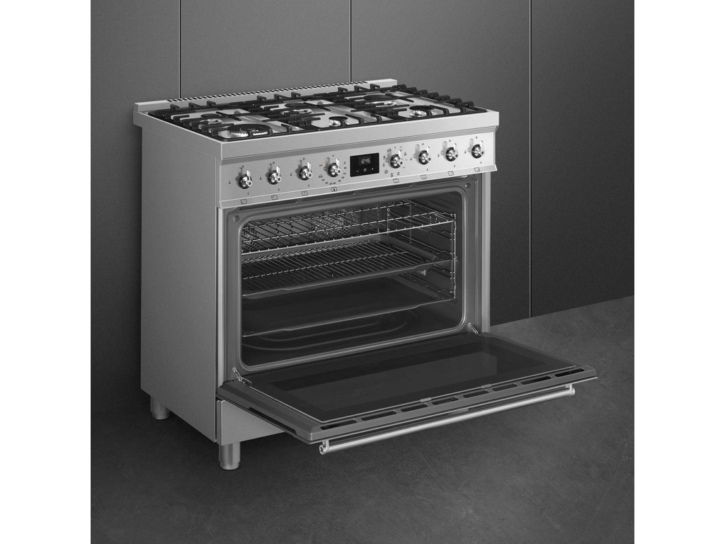 Sporák Smeg C9GMXD2 představuje kombinaci profesionálního výkonu a elegantního designu v širším formátu, který ocení náročnější uživatelé i větší domácnosti. Robustní nerezové provedení v industriálním stylu působí prémiově a zároveň je praktické na údržbu. Díky šířce 90 cm nabízí dostatek prostoru pro komfortní vaření více pokrmů současně a stává se dominantním prvkem moderní kuchyně.