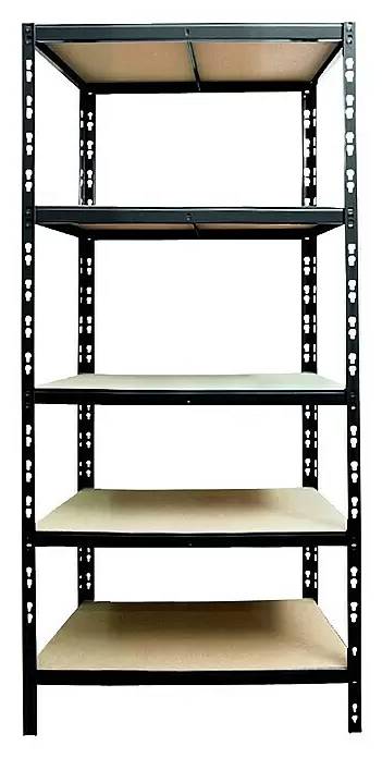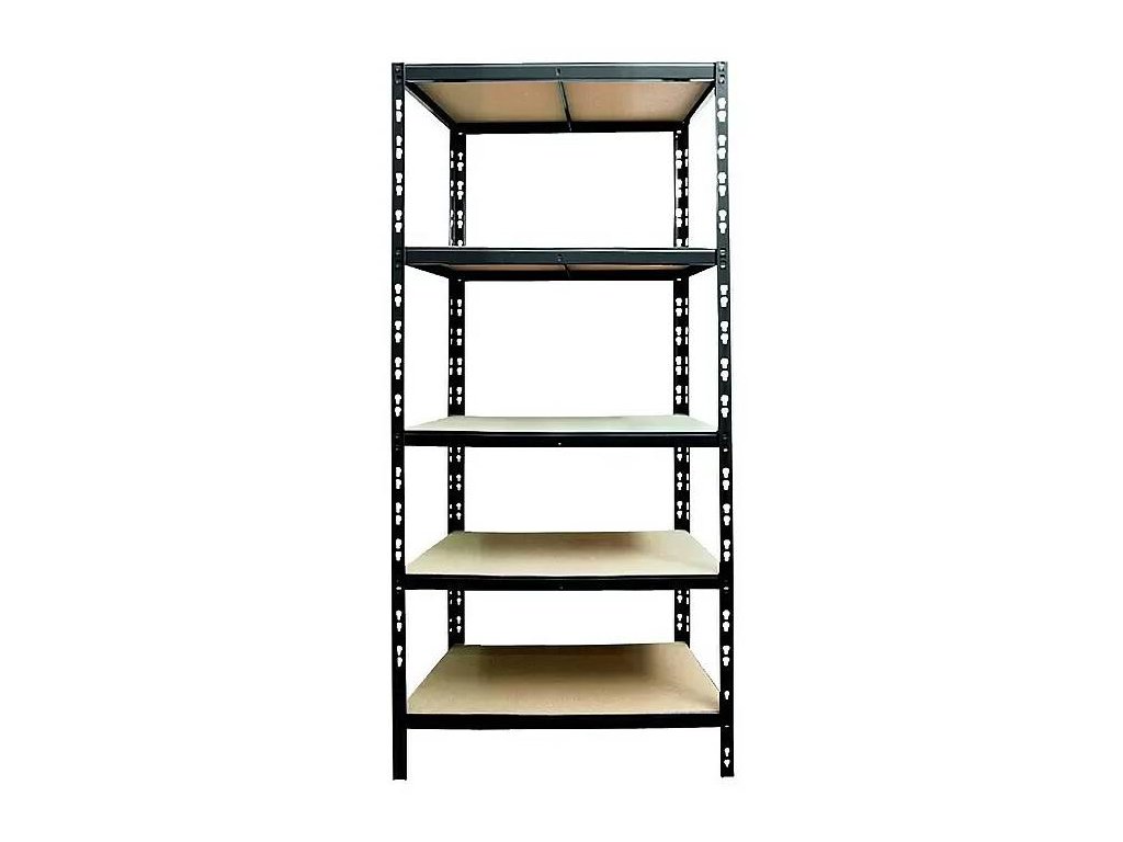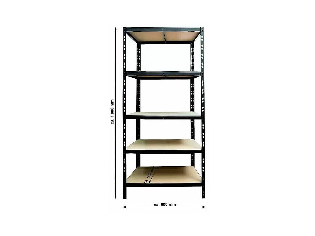 Kovový regál má 5 políc z panelov na báze dreva, ktoré sú zasadené do kovového rámu, a každá polica unesie až 290 kg pri rovnomernom rozložení hmotnosti.