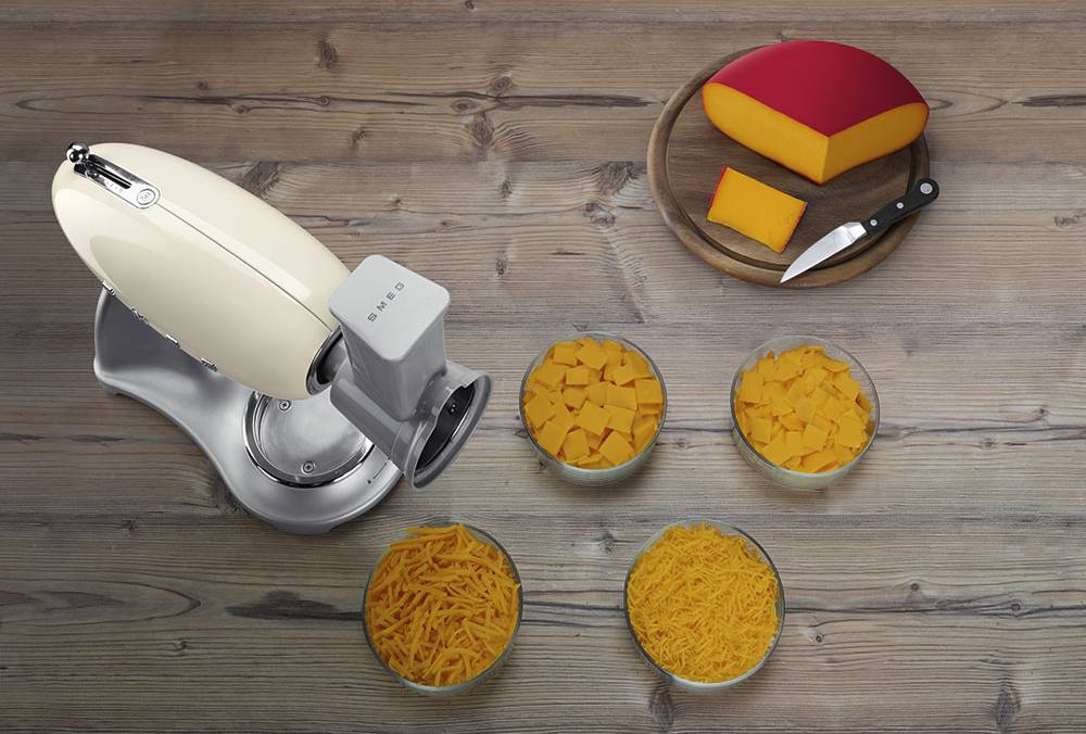 Multifunkčný krájač a strúhadlo so 4 vymeniteľnými valčekmi slúži ako príslušenstvo pre kuchynský robot Smeg. Súprava obsahuje telo strúhadla s plastovým baránkom a 4 valce na krájanie a strúhanie: stredný krájač, jemný krájač, hrubé strúhadlo a stredné strúhadlo.