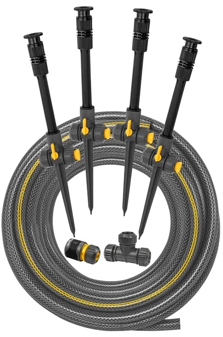 Kruhový zavlažovač od Neptun je ideálny najmä na zavlažovanie kvetinových záhonov do 78 m². V rozsahu 10 m môžete bez náradia plynule nastaviť uhol zavlažovania od 5˚ do 360˚. Pevná koncovka umožňuje jednoduchú inštaláciu do zeme. Súprava obsahuje 4 kruhové zavlažovače, 1 hadicu s dĺžkou 15 m a priemerom 12,7 mm, 1 rýchlospojku a 1 T-kusovú spojku na pripojenie hadíc. Všetky komponenty do seba zapadajú, takže nič nestojí v ceste bezproblémovému zavlažovaniu vášho záhradného záhonu.