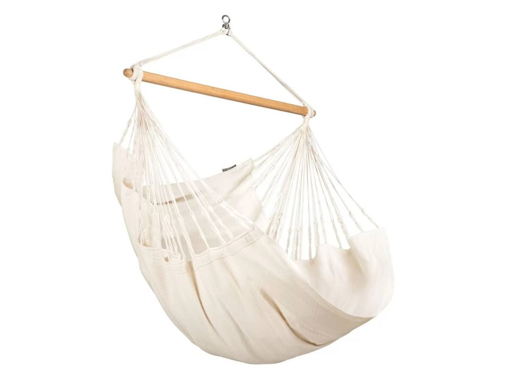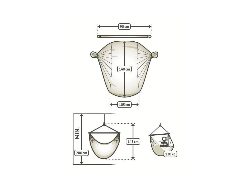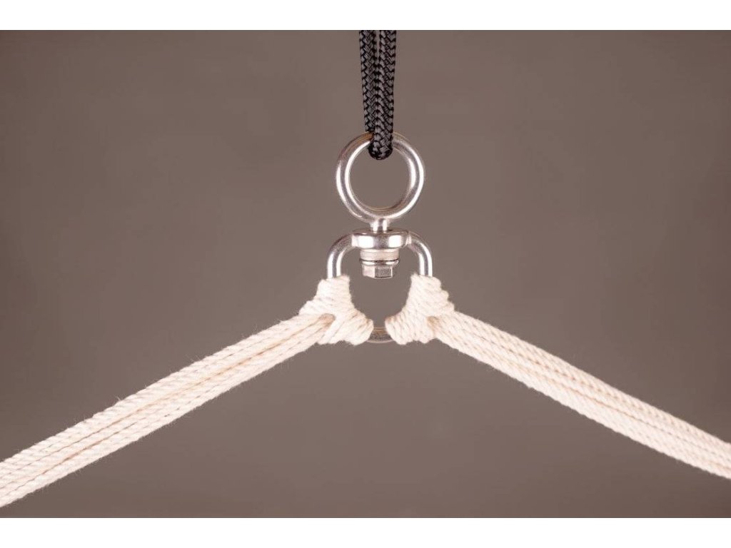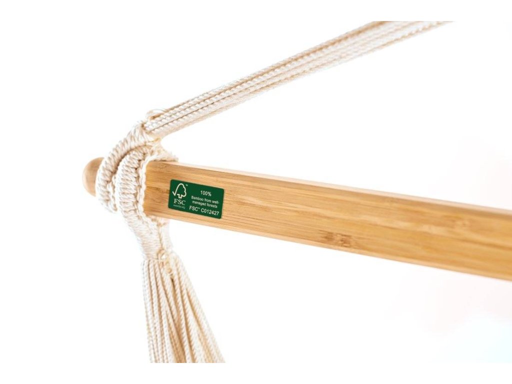 Vyrobené z vysokokvalitného bambusového dreva s dokonale hladkým povrchom. K dokonalému pohodliu prispieva veľký počet závesných šnúr, ktoré rovnomerne rozkladajú hmotnosť, a integrovaný bezpečnostný kolík, ktorý umožňuje plynulé otáčanie vo všetkých smeroch.