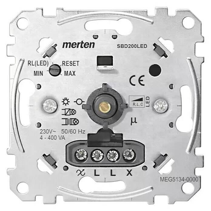 Univerzální otočná stmívací vložka Merten MEG5134-0000 pro LED svítidla slouží k ovládání osvětlení a ovládá se pomocí otočného knoflíku. Jmenovité provozní napětí je 230 V a typ zátěže pro halogenovou žárovku: 4 - 400 W při 230 V, žárovka: 4 - 400 W, LED žárovka: 4 - 40 W (režim RL LED), LED žárovka: 4 W - 200 VA (režim RC LED), nízkonapěťová halogenová žárovka s elektronickým transformátorem: 4 - 400 W a nízkonapěťová halogenová žárovka s feromagnetický transformátor: 4 W - 400 VA. Kapacita připojení svorek je 1 x 2,5 mm² pro pevný nebo ohebný kabel s dutinkou, 2 x 1,5 mm² pro pevný nebo ohebný kabel s dutinkou.
