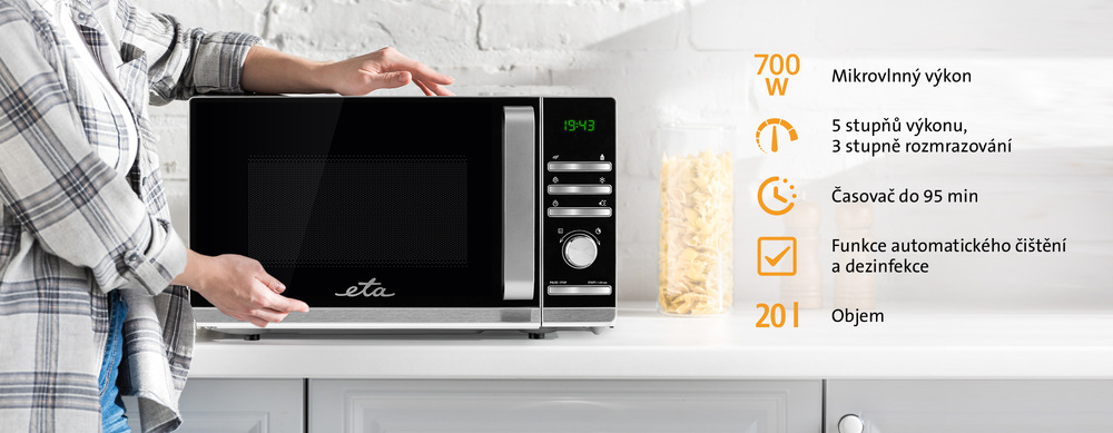 Ak túžite po jednoduchej a rýchlej príprave jedál, mikrovlnná rúraETA Galateo sa stane nepostrádateľnou súčasťou vášho kuchynského vybavenia. Má objem 20 litrov a maximálny výkon 700 W. Môžete si vybrať z 5 stupňov intenzity výkonu, 3 režimov rozmrazovania a6 prednastavených automatických programov varenia. Ľahko v nej pripravíte napríklad zemiaky, ryby alebo upečiete pizzu.