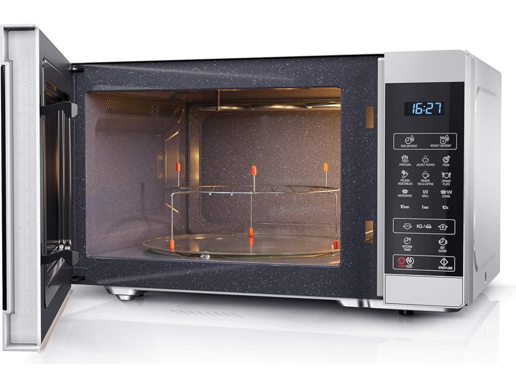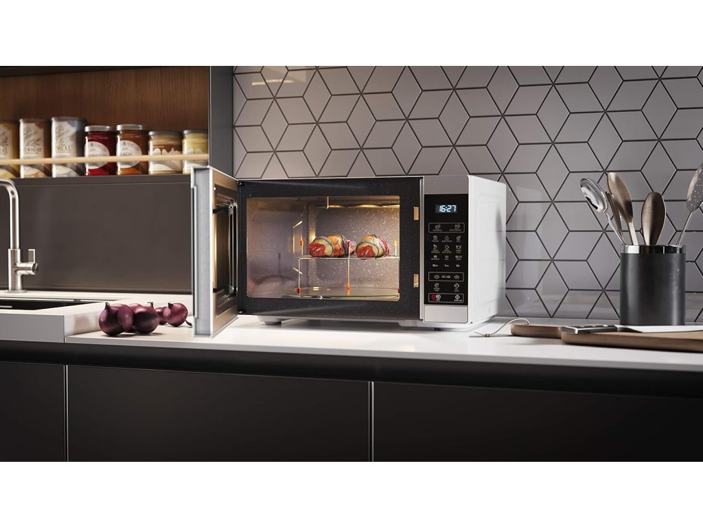 Kombinácia 900W mikrovlnného výkonu a 1100W grilovacieho výkonu umožňuje nielen rýchly ohrev, ale aj opekanie a grilovanie. K dispozícii je 11 úrovní výkonu a 8 automatických programov vrátane rozmrazovania podľa času alebo hmotnosti. Plne digitálne dotykové ovládanie je prehľadné a intuitívne, takže príprava jedla je rýchla a bezproblémová.
