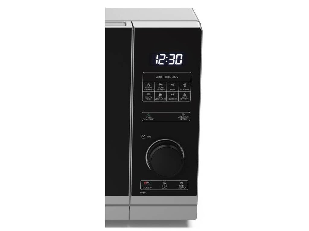 Průměr skleněného talíře je 27 cm a vnitřní prostor je z odolného nerezu. Mikrovlnná trouba je vybavena funkcí pro rozmrazování a ECO funkcí. Otevírání dveří je velmi pohodlné a dětská pojistka brání nechtěné změně nastavení.