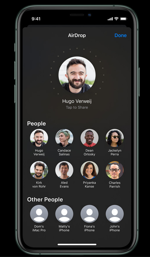 Uvnitř telefonu operuje čip Apple U1 s ultraširokopásmovou technologií pro vnímání prostoru. Díky tomu dokáže přesně iPhone najít jiná zařízení Apple se stejným čipem. Využijete to například při sdílení souborů přes AirDrop, kdy stačí zamířit telefon na druhý iPhone a ten se objeví na seznamu jako první.