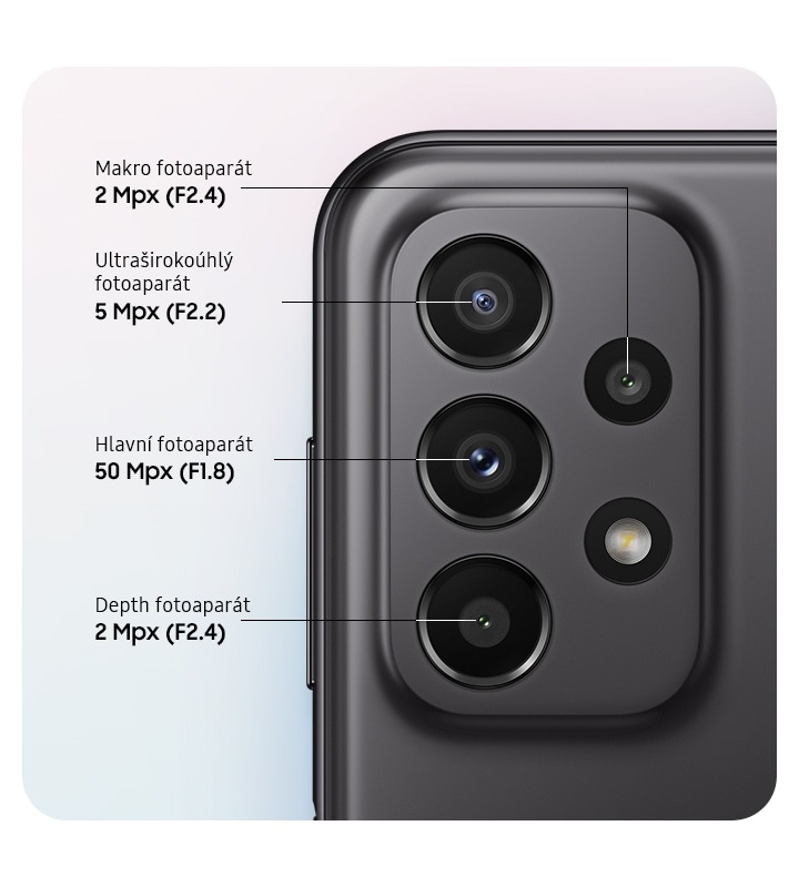 Dokažte svému okolí, že máte styl! Chytrý telefon Galaxy A23 5G otevírá dveře jednoduché eleganci v podobě působivého designu Ambient Edge. Ten vašemu zařízení zajistí unikátní vzhled prostřednictvím jemného spojení matného povrchu s fotoaparátem, který upoutá nejeden zrak.