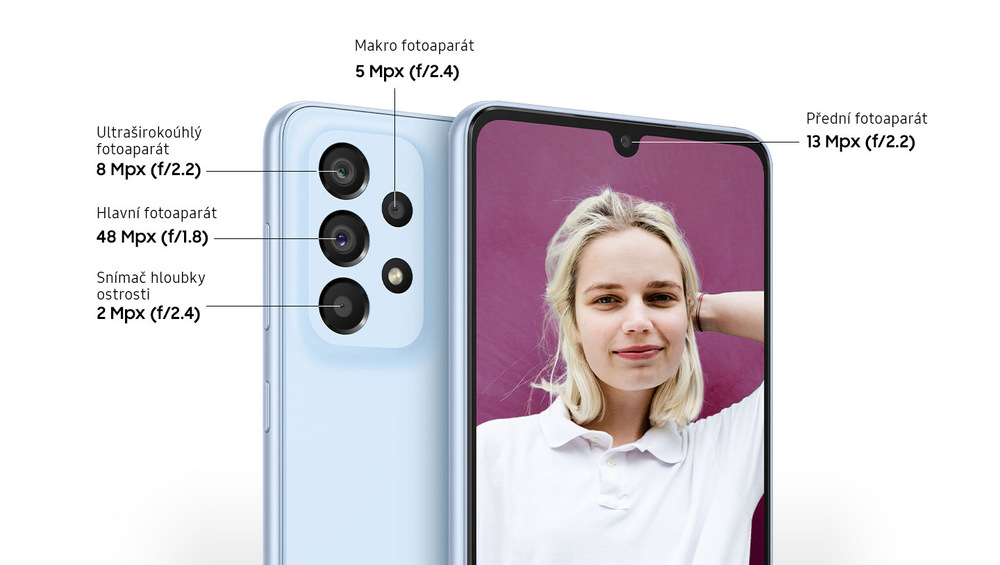 Neunikne vám ani jeden zaujímavý záber! Galaxy A33 5G od spoločnosti Samsung je vybavený profesionálnou fotografickou výbavou pre každú príležitosť. Nájdete tu 48-megapixelový hlavný fotoaparát s optickou stabilizáciou obrazu (IOS) na zachytenie krásne vyzerajúcich a ostrých momentiek. Na širšie zábery je tu 8 Mpx ultraširokouhlý fotoaparát a naopak, na detailné zábery využijete 5 Mpx makroobjektív. Hĺbkový fotoaparát zasa ponúka možnosť experimentovať s umeleckejšími zábermi a špecializovaný selfie fotoaparát vyhotovuje autoportréty, ktoré určite zaujmú.