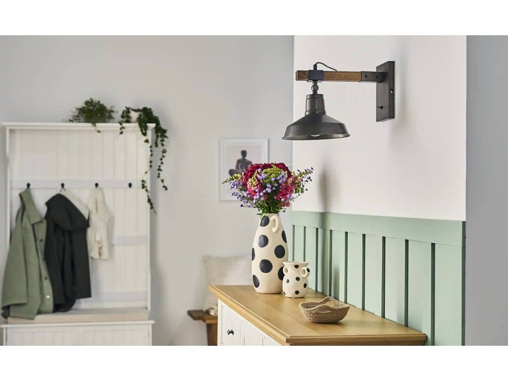 Nástěnné svítidlo Höffner Max pro interiéry, které kombinuje kovový rám a prvky dřeva, s povrchovou úpravou v černé barvě. Má patici typu E27 a maximální příkon 40 W – což umožní použití různých žárovek (včetně úsporných LED variant).