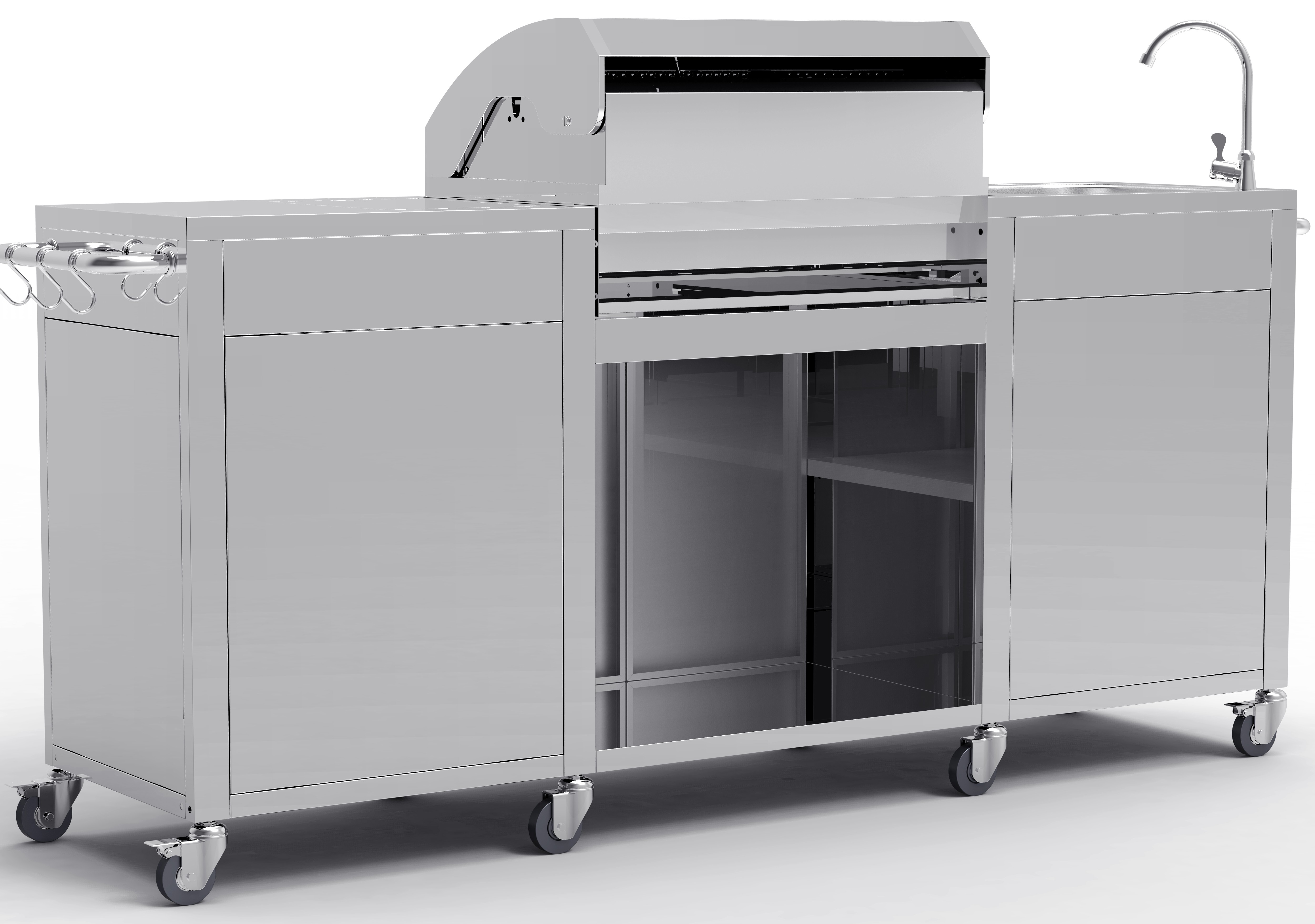 Nerezová konštrukcia a kvalitné spracovanieCelá kuchyňa je z ocele a nerezu, čo zaručuje trvanlivosť a odolnosť voči poveternostným vplyvom. Nerezový povrch sa ľahko udržiava a dodáva moderný a profesionálny vzhľad. chrómové grilovacie rošty a ohrievacia mriežka zabezpečujú rovnomerné varenie.