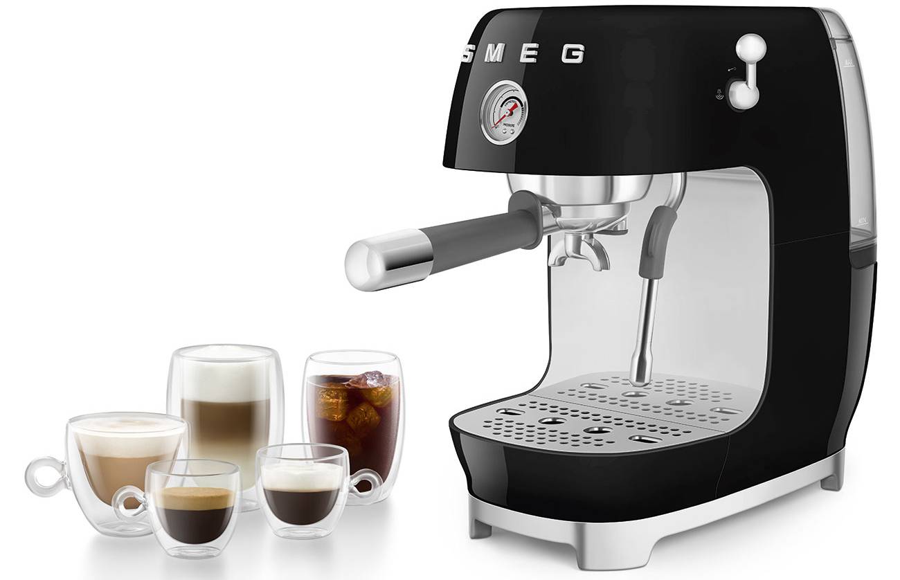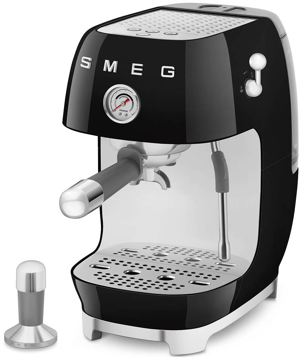 Tento kávovar od Smeg kombinuje ikonický štýl 50. rokov s najnovšou technológiou prípravy kávy. Jeho hladké línie, lesklé povrchy a precízne detaily z neho robia nielen výkonný spotrebič, ale aj štýlový doplnok každej kuchyne. Elegantný čierny dizajn pôsobí nadčasovo a vďaka kompaktným rozmerom ho ľahko umiestnite na pracovnú dosku bez toho, aby zaberal zbytočne veľa miesta.