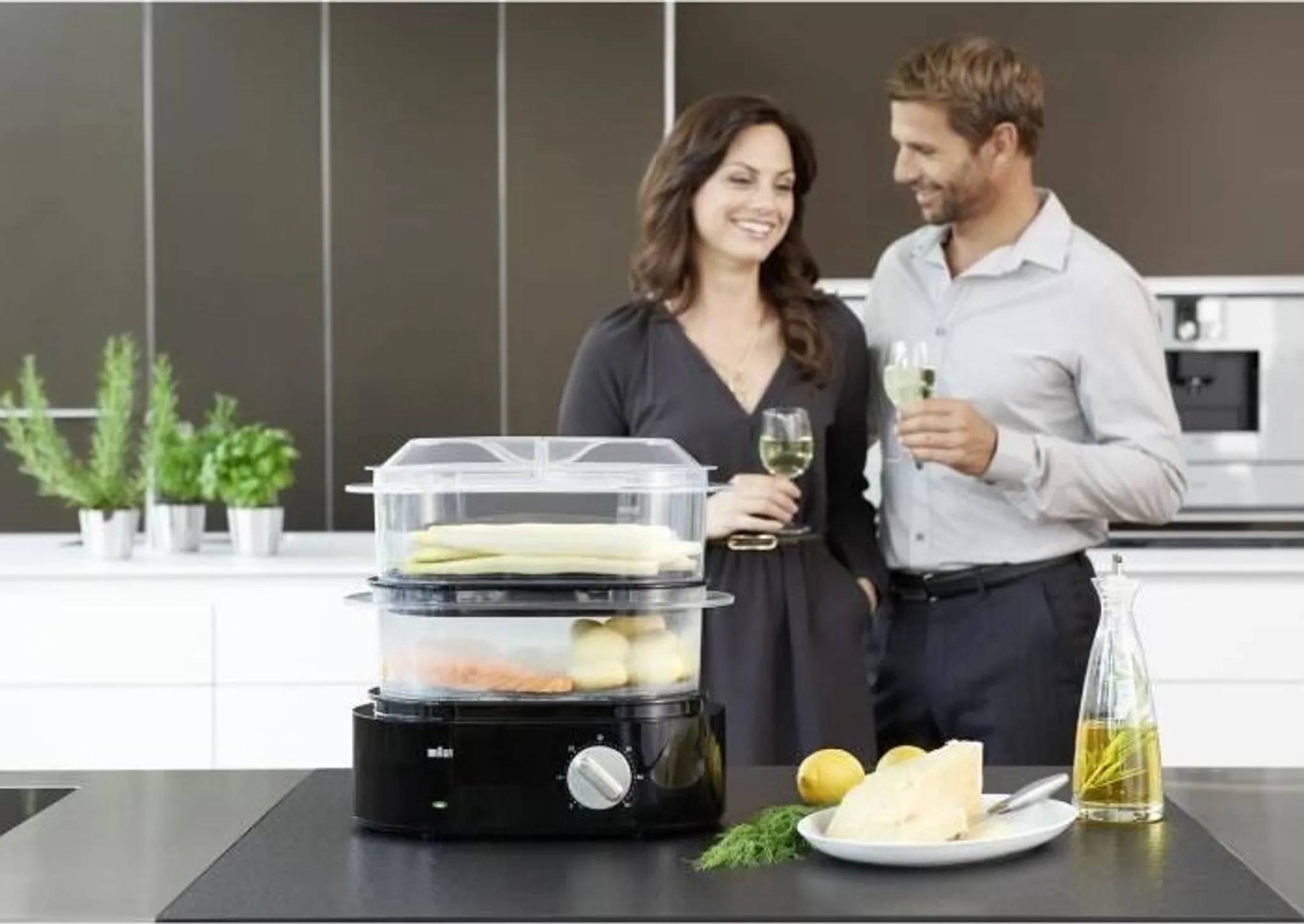 Parní hrnec Braun FS5100BK je moderní kuchyňský pomocník určený pro zdravé a rychlé vaření. Díky výkonu 850 W a celkovému objemu 6,2 litru umožňuje pohodlně připravit více porcí najednou. Je vyroben z kvalitního plastového materiálu v kombinaci transparentního a černého provedení, takže snadno zapadne do každé moderní kuchyně. Vaření v páře zachovává přirozenou chuť a živiny potravin, což ocení každý, kdo si potrpí na vyváženou a zdravou stravu.