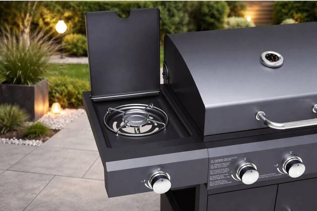 Výkonný plynový gril BestBerg BBBQ-28SBVďaka kombinácii štyroch hlavných horákov a jedného bočného horáka zvládnete celé menu naraz.