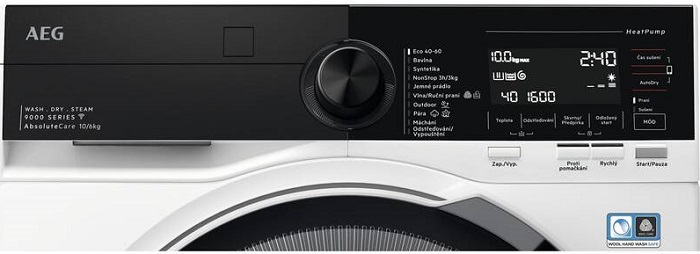 Volně stojící pračka se sušičkou AEG AbsoluteCare® 9000 LWR98165XC s předním plněním vám umožní prát až 10 kg a usušit až 6 kg prádla. Odstřeďování vypraného prádla probíhá při maximálních otáčkách 1 600 ot./min. a hlučnosti 76 dB. Pračka a sušička v jednom je osazena Ökoinvertor motorem. Vážená spotřeba vody pro praní a sušení představuje 50 l za cyklus. A pračkou AEG máte na výběr z 10 programů včetně možnosti odloženého startu. Displej pračky zobrazuje informace v českém jazyce pro snadnější orientaci v nastavení. Parní pračka disponuje elektronickou regulací spotřeby vody a možností volby nastavení otáček. Ukazatel zbytkového času vás v průběhu pracího či sušícího procesu informuje o zbývajícím čase dokončení spuštěného cyklu. Díky ochraně proti úniku vody je vaše domácnost chráněna před nečekanými nehodami. AEG AbsoluteCare® 9000 LWR98165XC umožňuje integraci do systému Google Home.