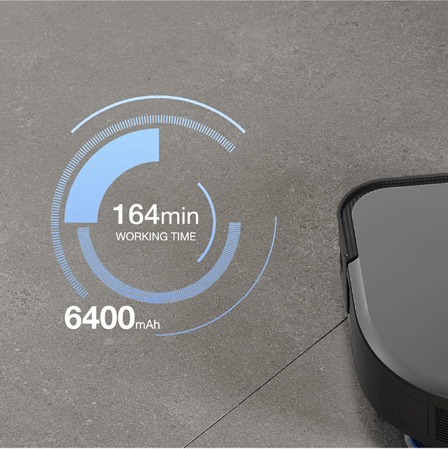 Užijte si nepřetržité čištění. Robotický vysavač je vybaven integrovanou lithiovou baterií o kapacitě 6400 mAh, která podporuje až 164 minut nepřetržitého čištění na jedno nabití. Rozkládá se na ploše až 145 metrů čtverečních a stav baterie se zobrazuje v reálném čase v aplikaci.