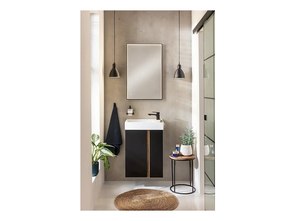 Skrinka pod umývadloBella Camargue ;je ideálnym riešením pre malé kúpeľne bez kompromisov v oblasti štýlu a funkčnosti. Jeho menšia hĺbka, bezstarostný dizajn a technológia tichého zatváraniaz neho robí moderný, praktický a estetický kus nábytku. Kombinácia matného čierneho korpusu a čelnej dosky spolu s panelom s dubovým efektom harmonicky zapadá do rôznych štýlov interiéru, najmä do moderného priemyselného dizajnu. Výroba v Európe zaručuje kvalitu a umožňuje štýlové zariadenie kúpeľne.
