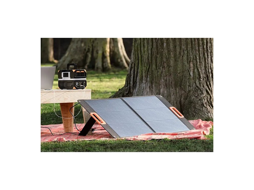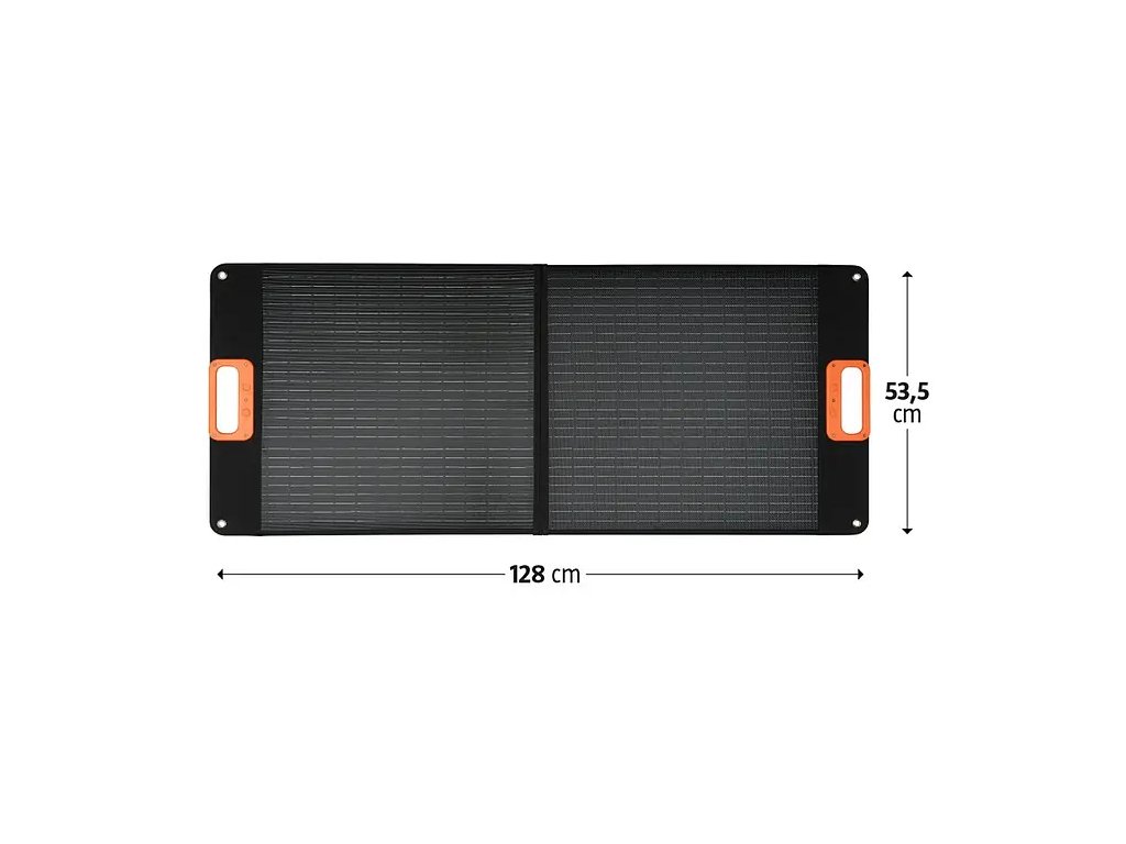 Panel váži približne 4 kg a možno ho ľahko zložiť do praktického puzdra s rukoväťou. Vďaka tomu sa ľahko prenáša a v aute alebo v batohu nezaberie veľa miesta. V rozloženom stave ponúka dostatočne veľkú plochu na účinný zber energie a oporné nožičky zabezpečujú stabilné umiestnenie.