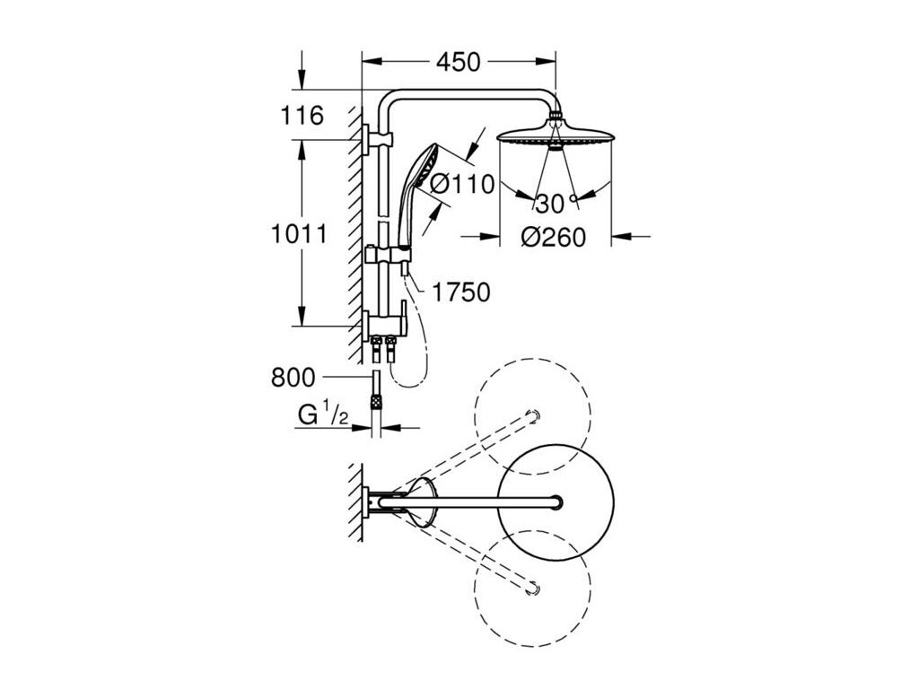 - Dĺžka horizontálneho otočného sprchového ramena 450 mm