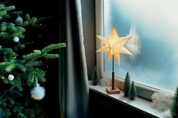 Svetelná dekorácia SOLVALLA v tvare hviezdy vytvorí vo vašom interiéri príjemnú a slávnostnú atmosféru. Elegantný papierový dizajn s jemnými výrezmi v tvare hviezdy prepúšťa svetlo a vytvára krásny dekoratívny efekt, ktorý je ideálny na okná, na komodu alebo na slávnostný stôl. S priemerom 45 cm a výškou 65 cm predstavuje nápadný, ale stále vkusný doplnok vianočných dekorácií.