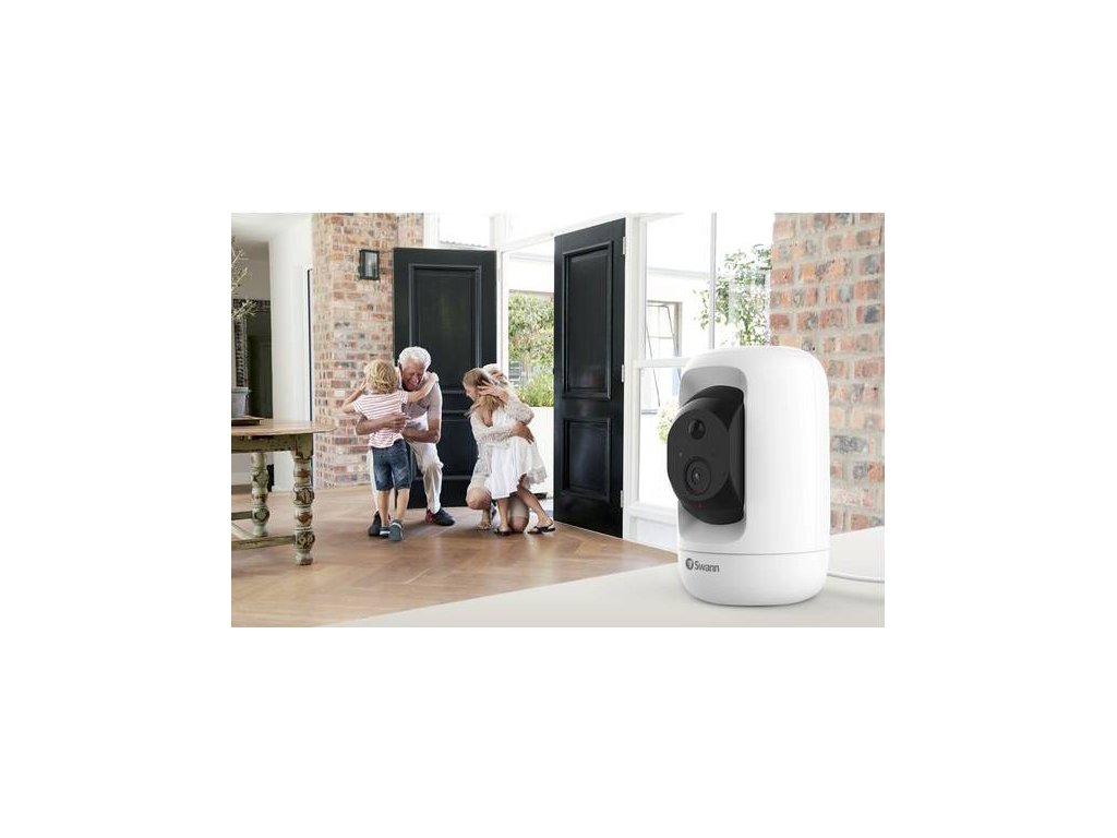 Sledujte svůj domov s vnitřní bezpečnostní kamerou Swann SWIFI-PTCAM232GB-EU. Ideální pro nájemní byty, není třeba vrtat žádné otvory do zdi. Stačí zapojit kameru a umístit ji na jakýkoli rovný povrch.