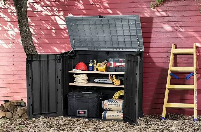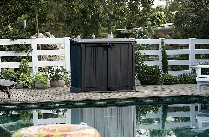 Box dreveného vzhľadu je ideálnyna uloženie koša, ale aj rôznehozáhradného náradia, kosačiek, grilov a mnohých ďalších vecí. Moderný úložný box pojme2 koše s objemom až 120 litrov. Je vyrobený z polypropylénového plastu. Vďaka tomu je mimoriadneodolný voči poveternostným vplyvoma UV žiareniu a ideálny na vonkajšie použitie. Záhradný box sa dá uzavrieť visiacim zámkom (nie je súčasťou balenia).