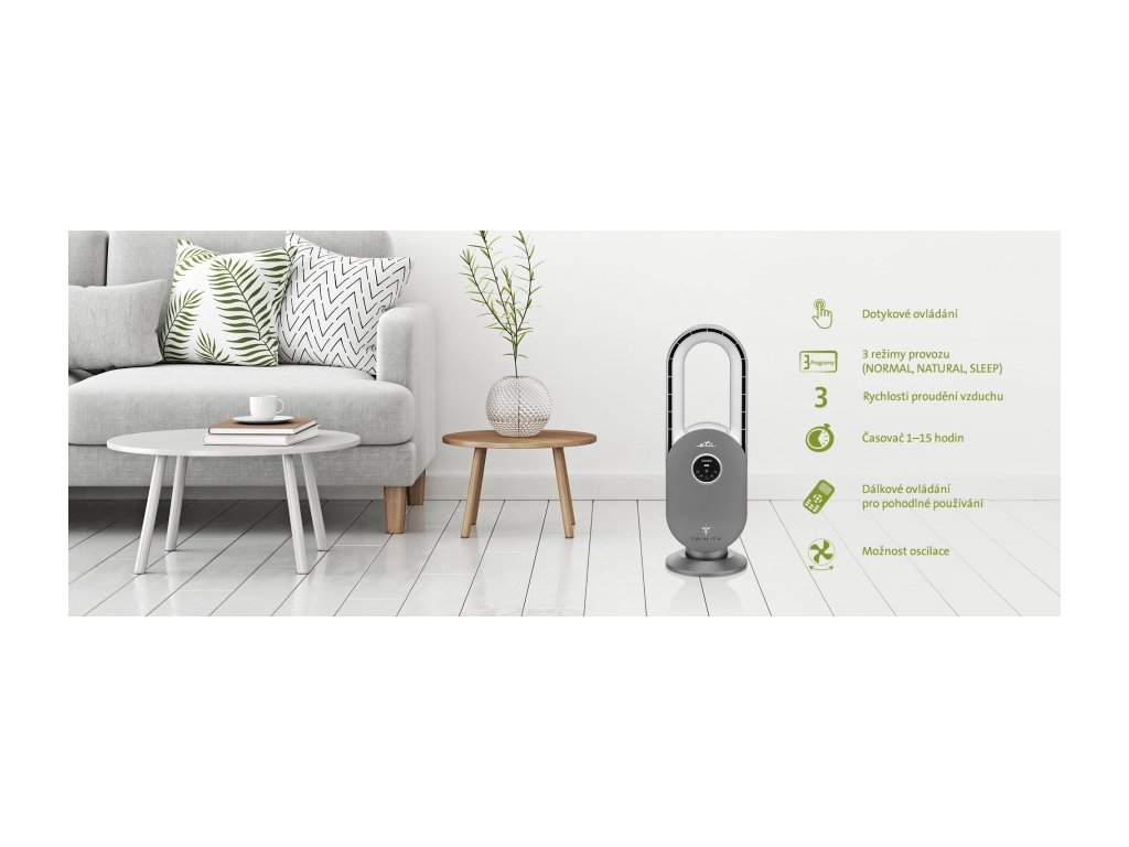 Moderný ventilátor bez otáčania vás nebude rušiť pri odpočinku ani pri sledovaní obľúbeného programu. Ani pri maximálnom výkone neprekročí hladina hluku 59 dB. Pre bezpečnú prevádzku je ventilátor vybavený aj ochranou proti prehriatiu.