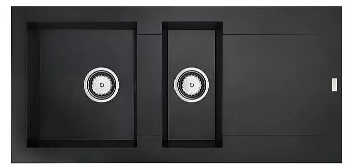 - Vestavný dřez s odkapávačem Carea Dukkah / 2 otvory pro baterii a otočný excentr / 1 1/2 umyvadla / CAREAlith® / 105 x 50 cm / odolnost do 300 °C / černá