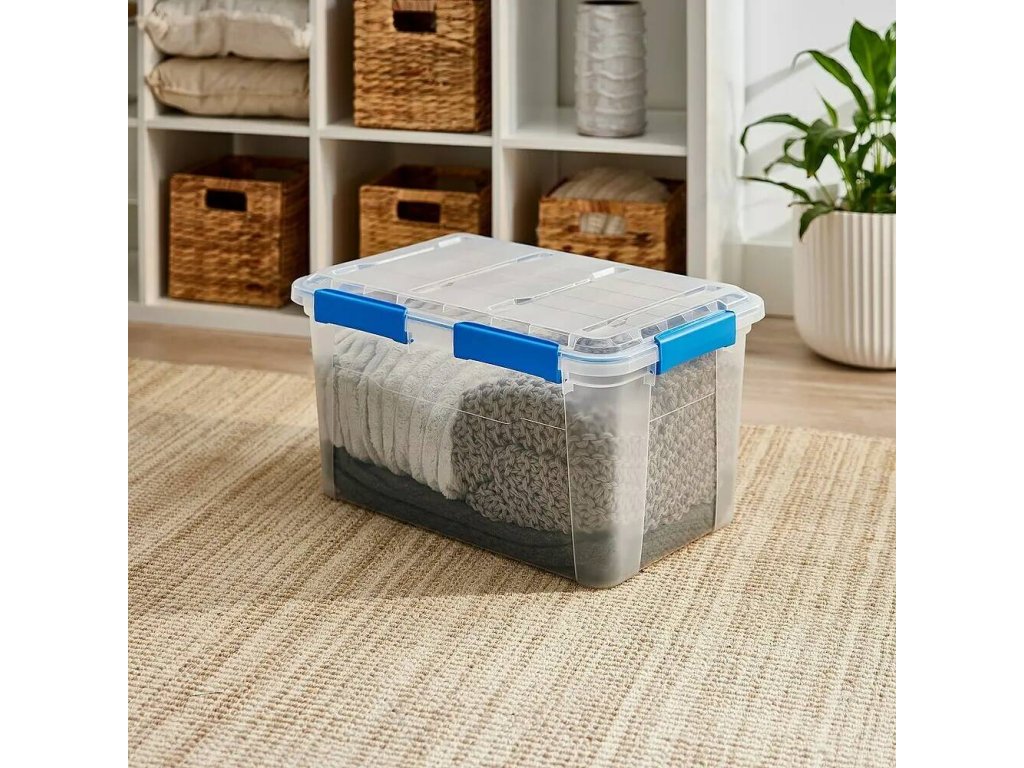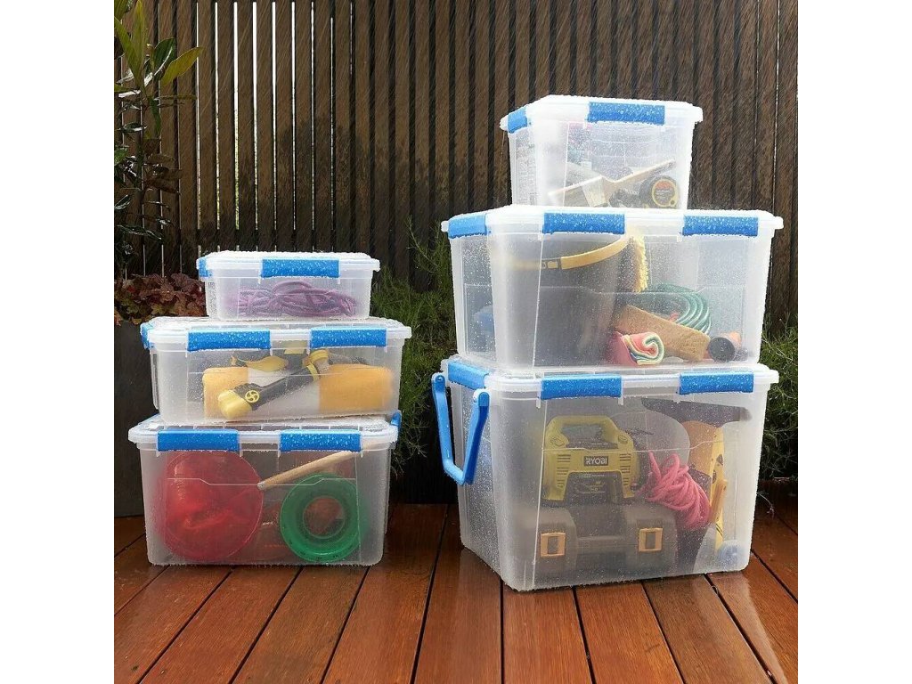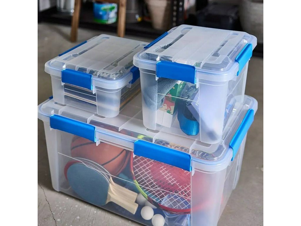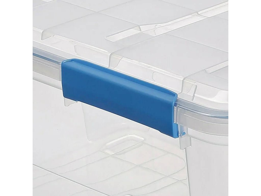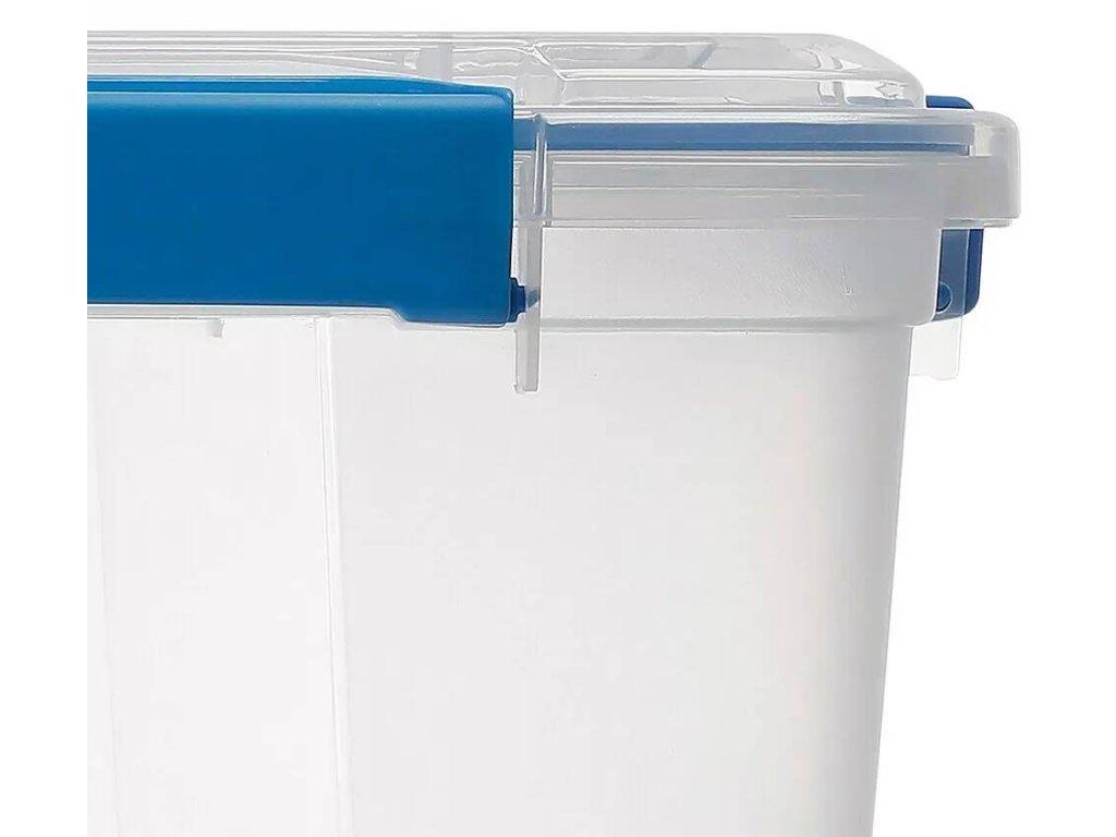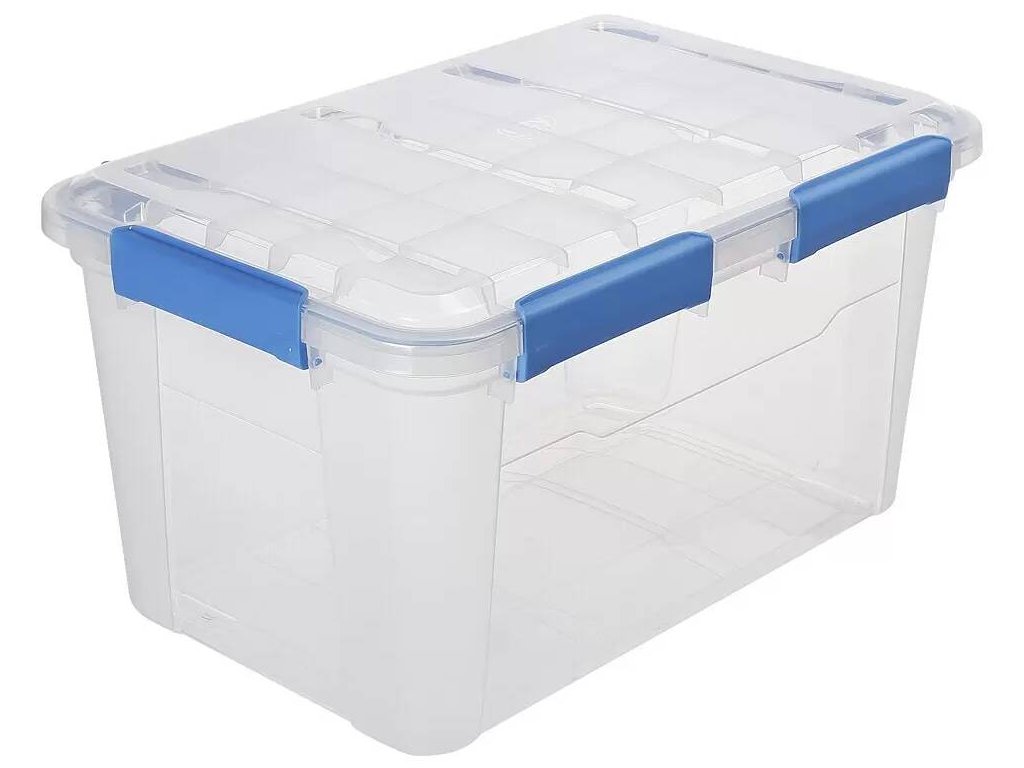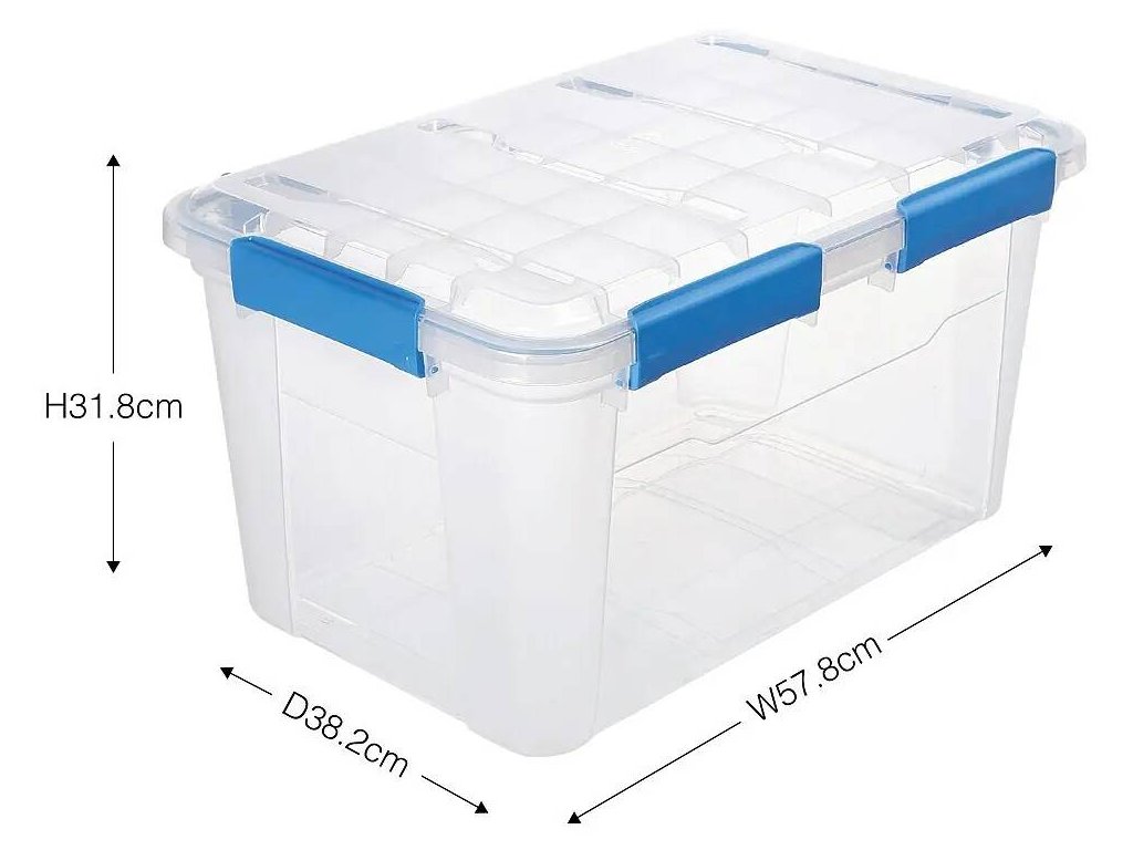 Tato průhledná plastová boxová nádoba s rozměry 57,8 x 38,2 x 31,8 cm a objemem 50 l je vyrobena z odolného plastu a nabízí skutečně vodě i prachu odolné řešení díky certifikaci ochrany IP67. Je ideální pro ukládání věcí v nepříznivém prostředí, například v kotelně, garáži nebo při kempování. Modré robustní přítlačné uzávěry zajišťují pevné stažení víka a silikonové těsnění spolehlivě chrání obsah před proniknutím vody, přičemž je možné box ponořit až do 1 m hloubky po dobu půl hodiny.