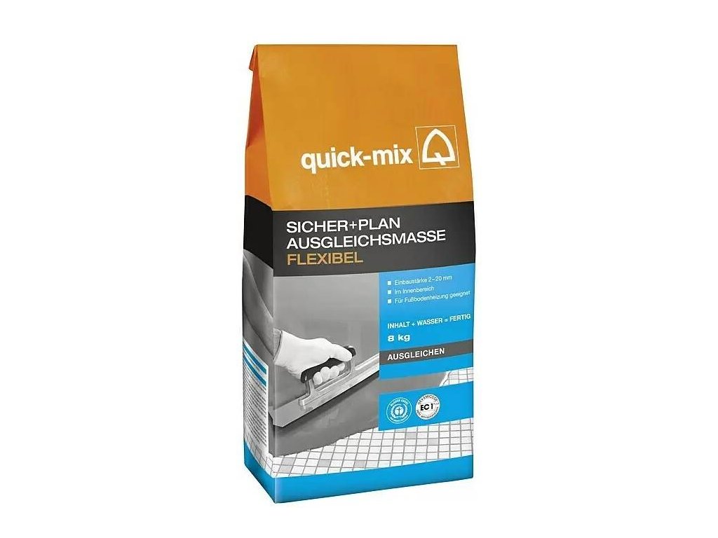 Quick-Mix vyrovnávacia hmota je samonivelizačný poter, ktorý je vhodný na vyrovnávanie poterov a betónových podkladov. Po približne 12 hodinách je pripravená na následné obkladanie keramickými obkladmi a dlažbami. Na paropriepustné a na vlhkosť citlivé krytiny, ako napr. PVC alebo parkety, sa musia vykonať merania v centimetroch. Ak sa nameraná zostatková vlhkosť pohybuje v rozmedzí 2,5 - 3 %, je možné inštalovať paropriepustné krytiny. V prípade tenkovrstvových tesniacich materiálov do 3 mm sa pripravenosť na pokrytie paropriepustných krytín (napr. kobercov alebo PVC podláh) dosiahne po 24 hodinách a v prípade parkiet a laminátu približne po 48 hodinách.