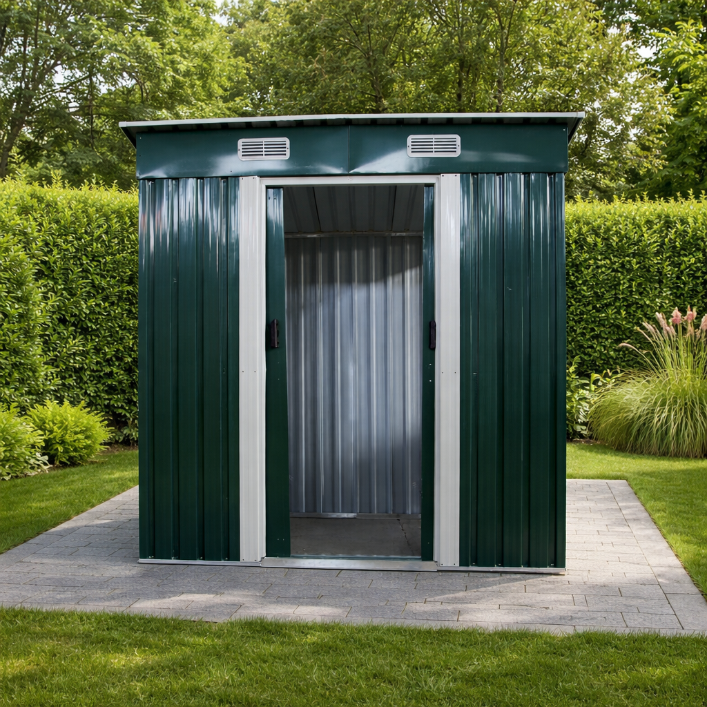 Moderný dizajn s praktickou šikmou strechouKovový záhradný domček v zelenej farbe pôsobí elegantne a zároveň technicky čisto. Šikmá strecha zabezpečuje účinný odvod vody a snehu.