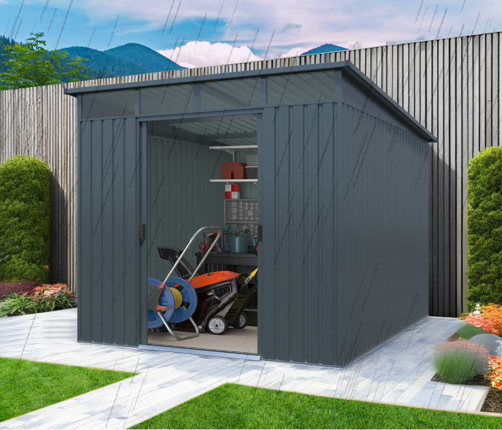 Odolný voči dažďu, snehu a vetruOcelová konštrukcia dodáva domčeku odolné a robustné vlastnosti. Stavba je veľmi jednoduchá a pohodlná.TIP: Vďaka streche v tvare pultovej strechy sa na záhradnom domčeku nezhromažďuje voda.