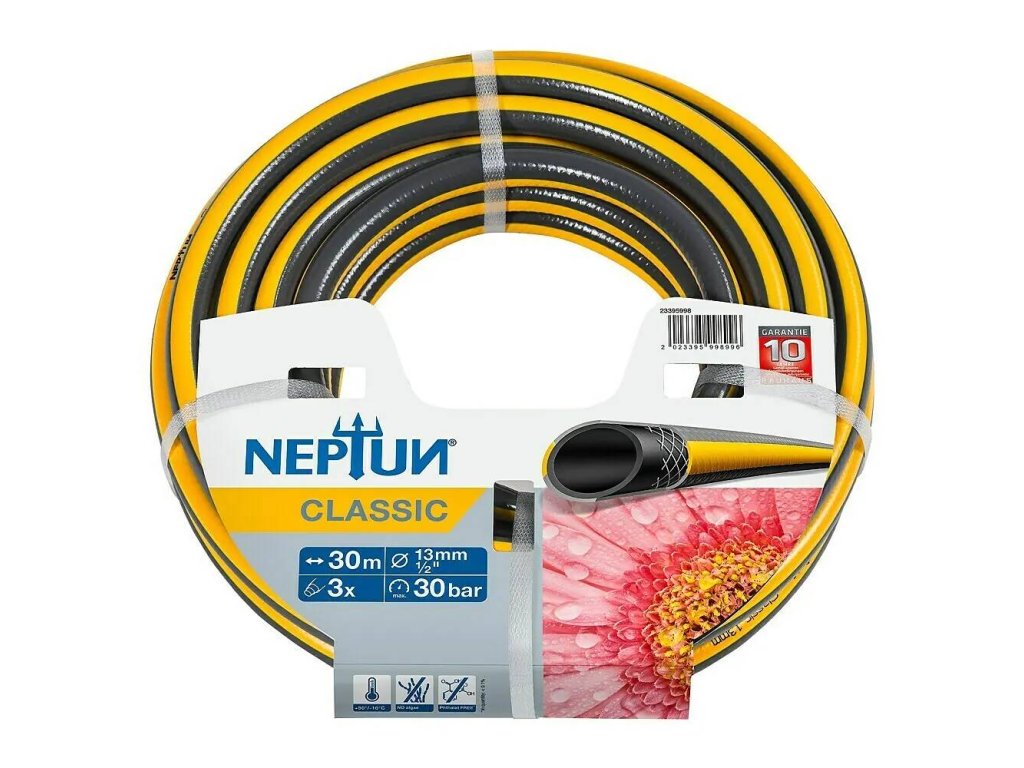 Záhradná hadica Neptun Classic je ideálnou voľbou na bežné zavlažovanie záhrady a pripojenie k zavlažovacím systémom. Hadica si zachováva svoj tvar, nekrúti sa a ľahko sa s ňou manipuluje, čo výrazne uľahčuje zavlažovanie. Je vyrobená so špirálovým výpletom, ktorý zvyšuje jej pevnosť a odolnosť proti zamotaniu, pričom je šetrná k životnému prostrediu - neobsahuje kadmium, bárium ani ftaláty.