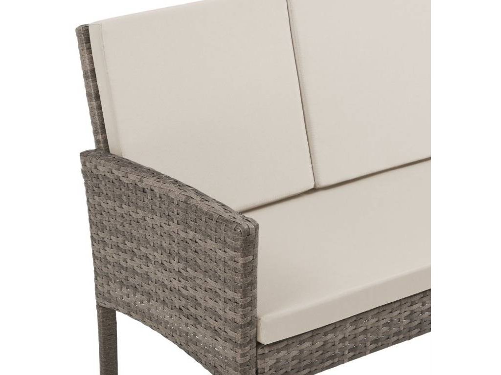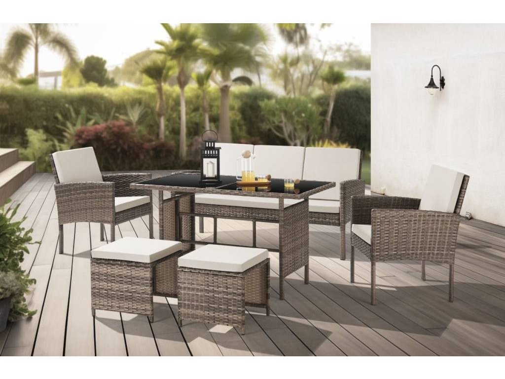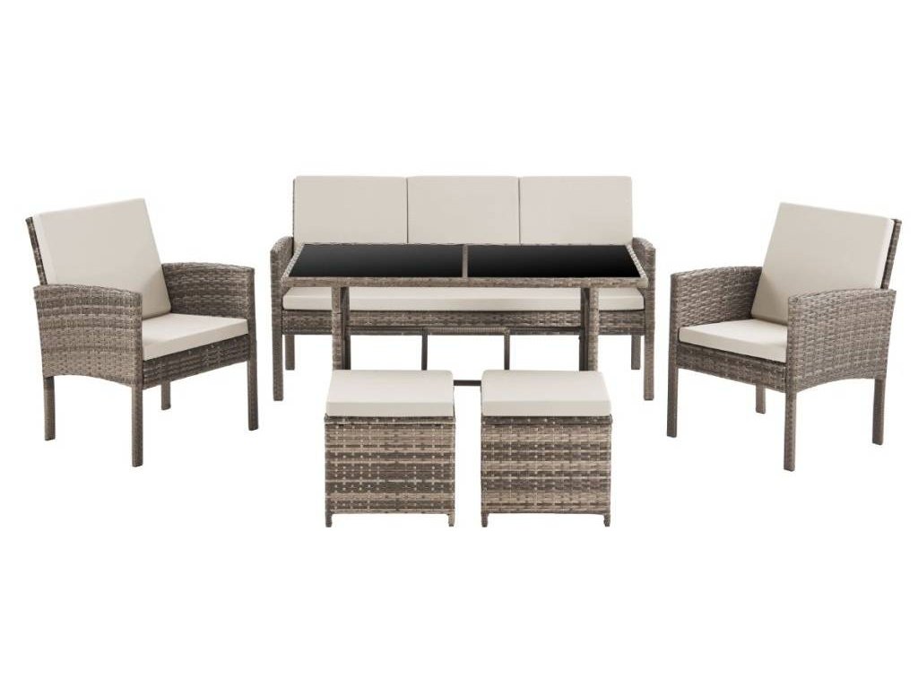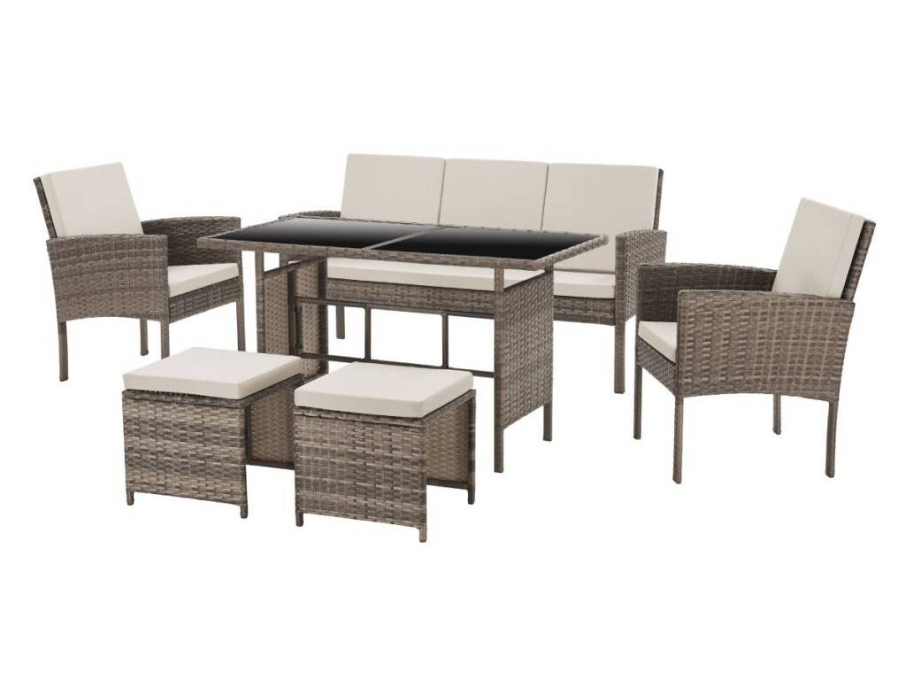 Súprava obsahuje ajdve podnožky, ktoré môžete použiť na pohodlné natiahnutie nôh alebo ako ďalšie miesto na sedenie. Podnožky sú rovnako ako pohovka a kreslá vybavené mäkkými vankúšmi pre maximálne pohodlie.Priestorový záhradný stôl s tvrdeným sklom dodáva súprave moderný a elegantný vzhľad. Tvrdené sklo je odolné a ľahko sa udržiava, čo zaručuje dlhú životnosť stola a jeho praktické využitie. Na stôl môžete umiestniť nápoje, občerstvenie alebo dekorácie a vytvoriť tak útulný a štýlový priestor pre vaše vonkajšie stretnutie.
