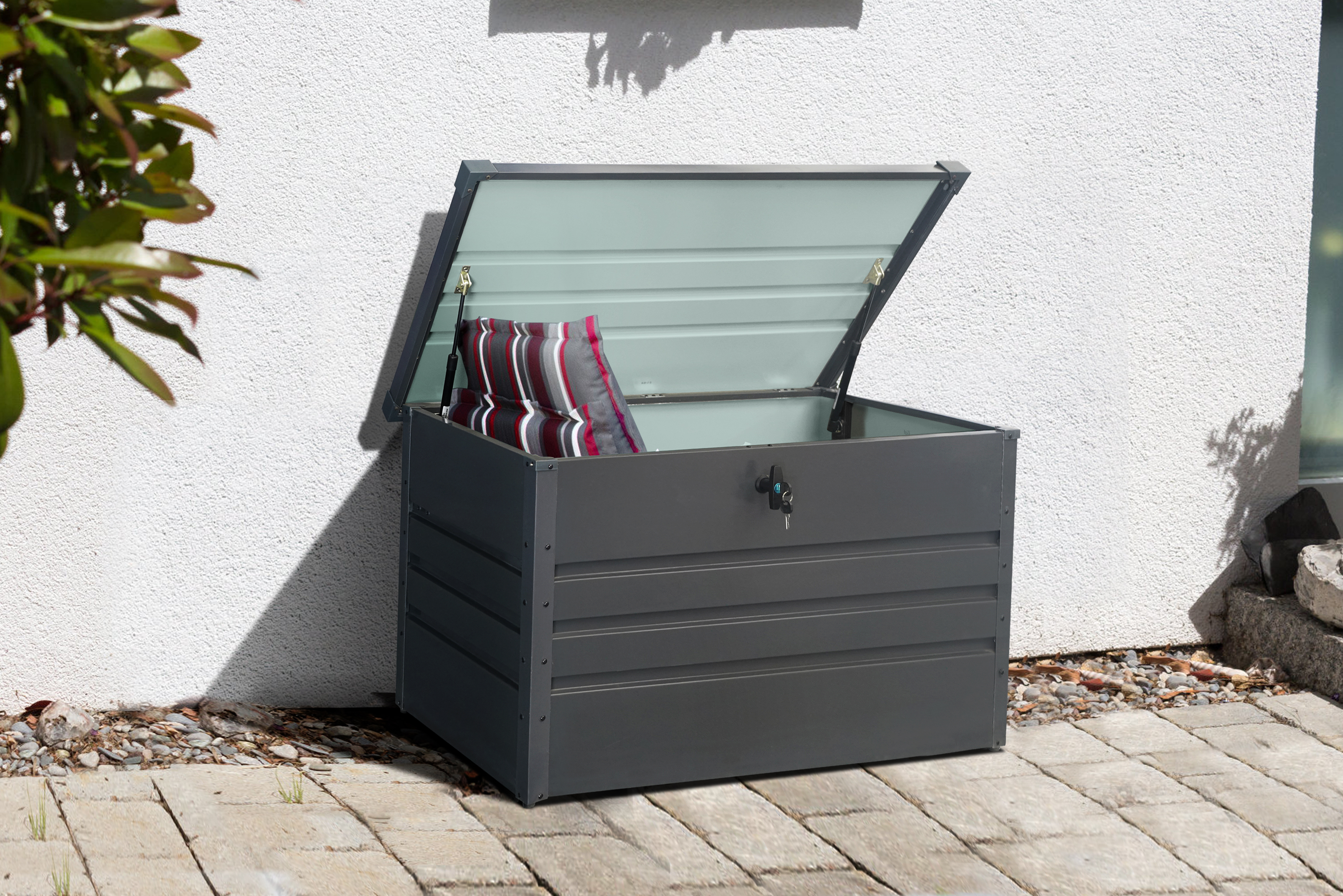 Zabudnite na neustále prenášanie vonkajšieho textilu domov a potom späť do záhrady. V praktickom kovovom boxe pohodlne uložíte sedacie vankúše, podušky, deky a ďalšie textilné doplnky. Vďaka praktickému plechovému materiálu môžete box jednoducho nechať vonku a mať istotu, že všetko vnútri zostane suché aj počas búrky a silného dažďa. Ako bonus praktický zámok na kľúč zaistí, že sa do boxu nedostane nikto iný.