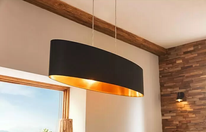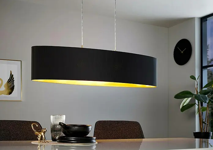 Závesné svietidlo Eglo Maserlo v čiernej farbe je výrazným dizajnovým prvkom, ktorý okamžite upúta pozornosť. Harmonická kombinácia čierneho textilného tienidla a zlatého vnútorného povrchu vytvára luxusný vzhľad a zároveň poskytuje teplý, príjemný svetelný efekt. Svietidlo sa dokonale hodí do moderných aj elegantných interiérov.