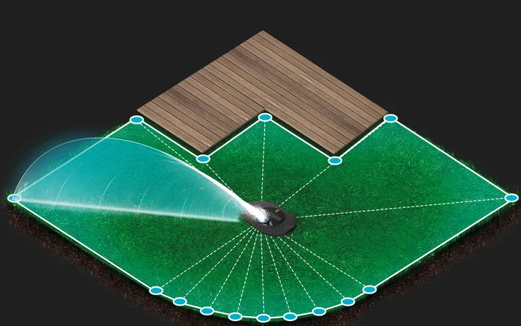 Systém umožňuje kontúrové zavlažovanie, t. j. programovanie bodov, ktoré sledujú skutočný tvar trávnika. Dosah hlavice je 2 až 10 metrov a sektor možno nastaviť v rozsahu 25° až 360°, takže voda dopadá rovnomerne bez prelievania na cestičky alebo suché miesta. Nízka výška rozstreku minimalizuje vplyv vetra a straty vody.
