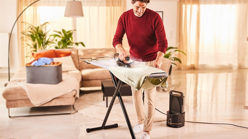 Vďaka dômyselnému dizajnu je žehlička na žehliacej doske umiestnená vertikálne a je veľmi stabilná. Systém Anti-drip chráni oblečenie pred mokrými škvrnami. Pohodlnú manipuláciu počas žehlenia zaisťuje 1,9 m dlhý napájací kábel, ktorý možno vďaka držiaku pripevniť k žehliacej doske, takže počas žehlenia neprekáža.